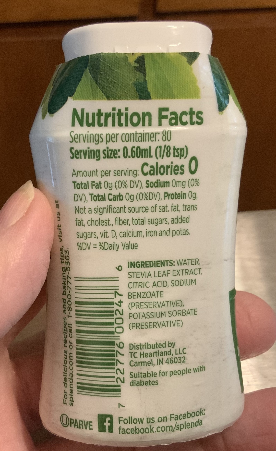 *And as you can see, it does state Carbs <1g, so there is a trace amount… and at home I actually use Truvia mostly, which is made from Stevia. But I find the Stevia powder form to have an after-taste I’m not real keen on. So the Truvia has a lessened after-taste, and they sell it at our grocery store. But no matter which of these I use, I never use any of them in anything, unless it’s while having & during a meal itself. … To me drinking anything sweet, or using sweeteners outside of meal times itself is akin to snacking, since it is said to spike insulin just as with any consumption of carbs.