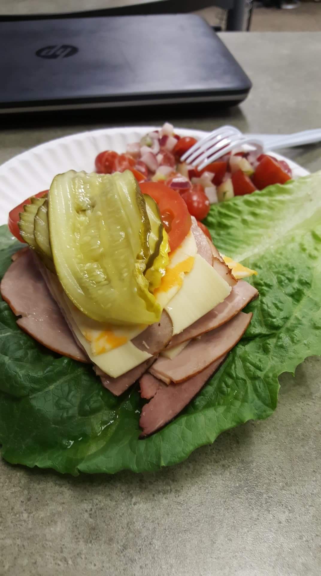 While he was on his trip, the company served subs one day. At the end of the food line, along with the condiments, they offered enormous leaves of lettuce, almost certainly intended to be used as wraps. It’s nice to see stuff like that.