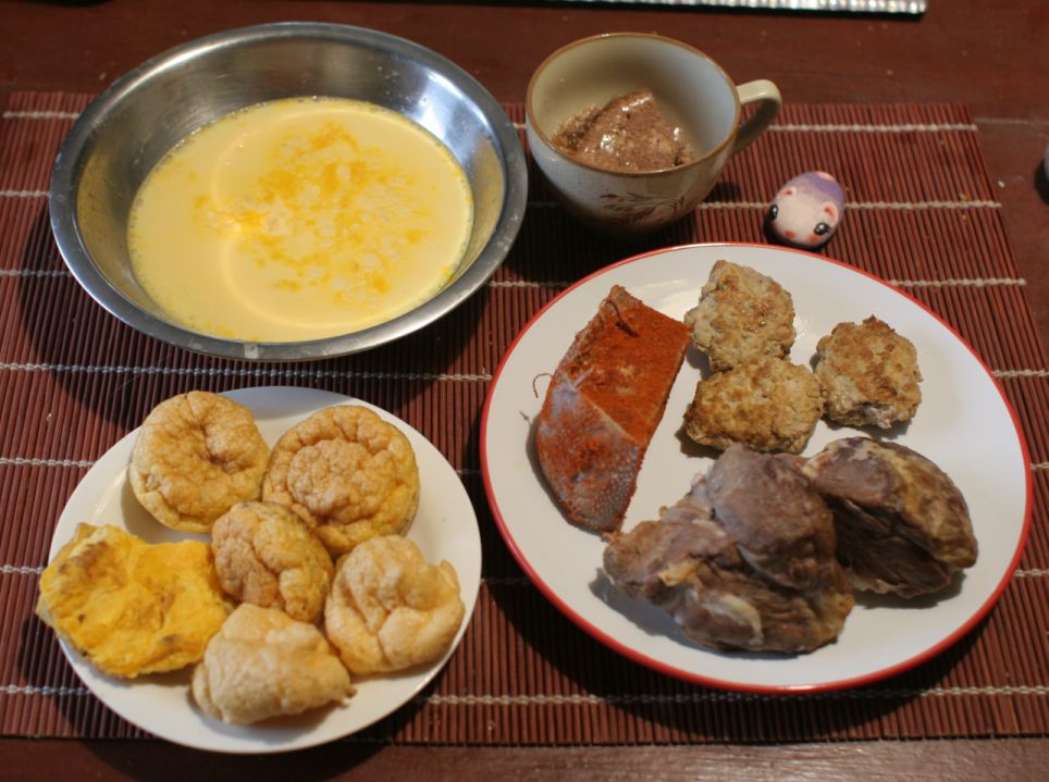518g pork chuck, 116g beef tongue, 4 eggs and 3 yolks for today. And the cheese. I had no problems with my food today. Even the super salty egg pudding was eaten with the not salty enough meat items (poor thing couldnāt shine that way, tomorrow(?) I will do it better!).