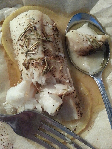Tuck the excess parchment behind the fish, carefully not spilling any liquid inside the packet. Add a spoon and fork to complete the rustic plating presentation.