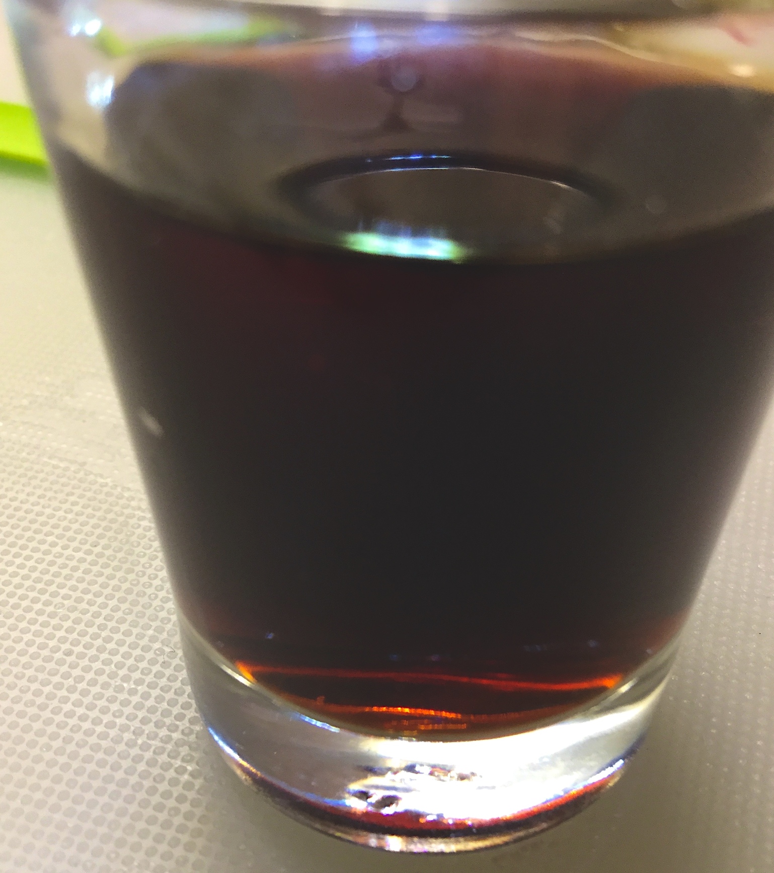 I poured a bit less than half the extract through a paper coffee filter into a smaller bottle. It’s clear, transparent and very dark.