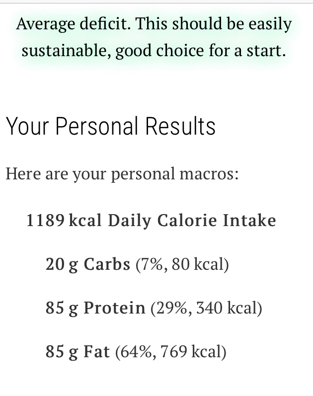 Thanks to the members here, I found my way to Keto Calculator. I have been keeping my net carbs below 20g, and I have to admit the fat and protein portions need work.