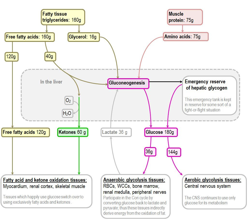 So let’s look at the fuel flow during fasting. This is a model of the energy flow of a human on day 1 of a fast from George Cahills starvation in man