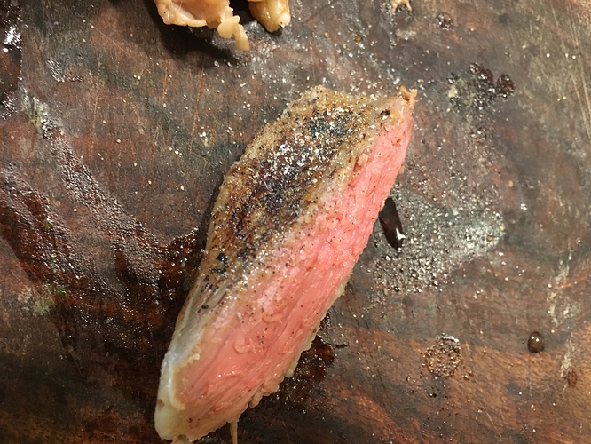Pic of tri tip not seared yet so not very pretty. But I like the degree of doneness it has. Small piece was seared and seasoned.