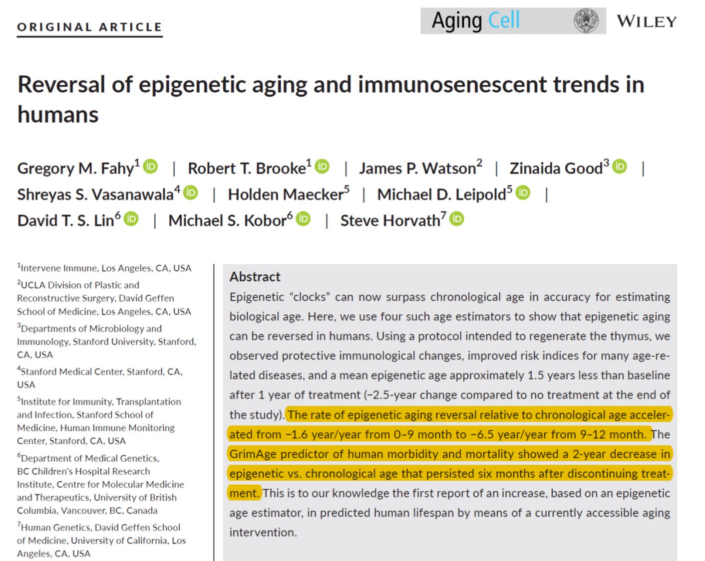 I have seen this paper from the tweeter of Satchin Panda, so it seems legit: healthy middle aged males go down 6.5 years in biological age by taking "a cocktail of growth hormone, metformin, and dehydroepiandrosterone (DHEA) ".