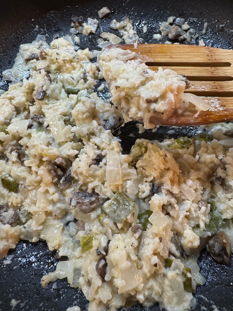 Add the dried cauliflower to the onion mixture, more butter if needed. Add a bit of cream and grated Parmesan cheese.