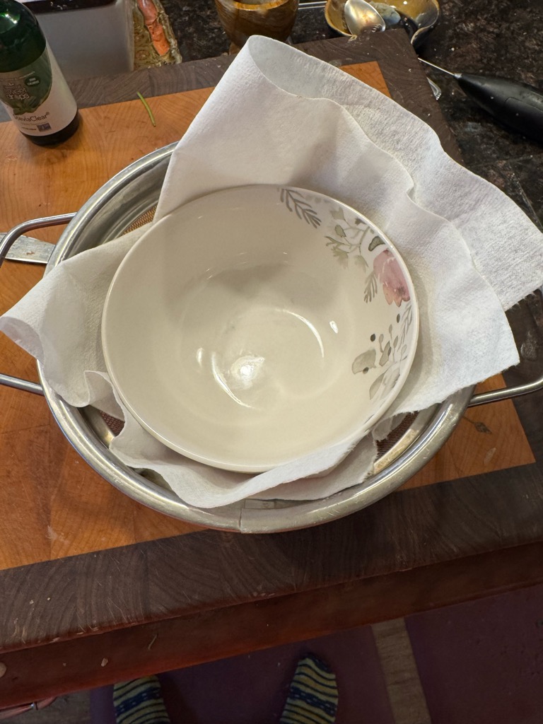 And saute onion and garlic in a liberal amount of butter. The key is getting all the water out of the cauliflower. I nuke it for 5 minutes then prepare a small colander lined with paper towels. Put the cooked cauliflower in it and cover with more paper towels. Use a bowl to press all the liquid out (in the sink).