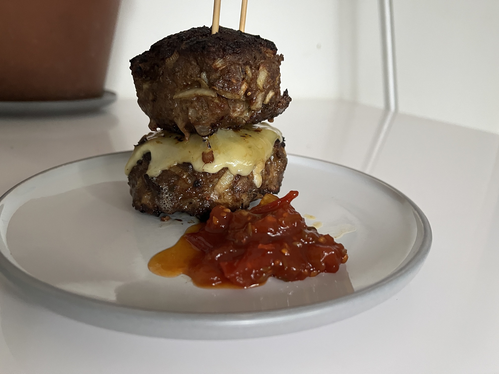 Beef burgers, cheese and a small side of homemade tomato scotch bonnet jam (no added sugar)