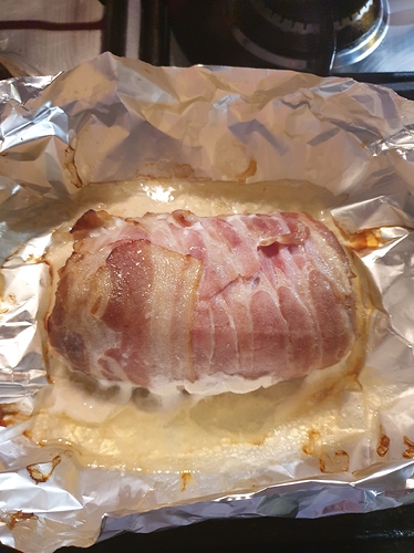Cod loin wrapped in bacon not as nice as i thought it would be. Tried a bit of the bacon on its own without the cod and it was completely tasteless. May have to have something later that has a bit of taste.