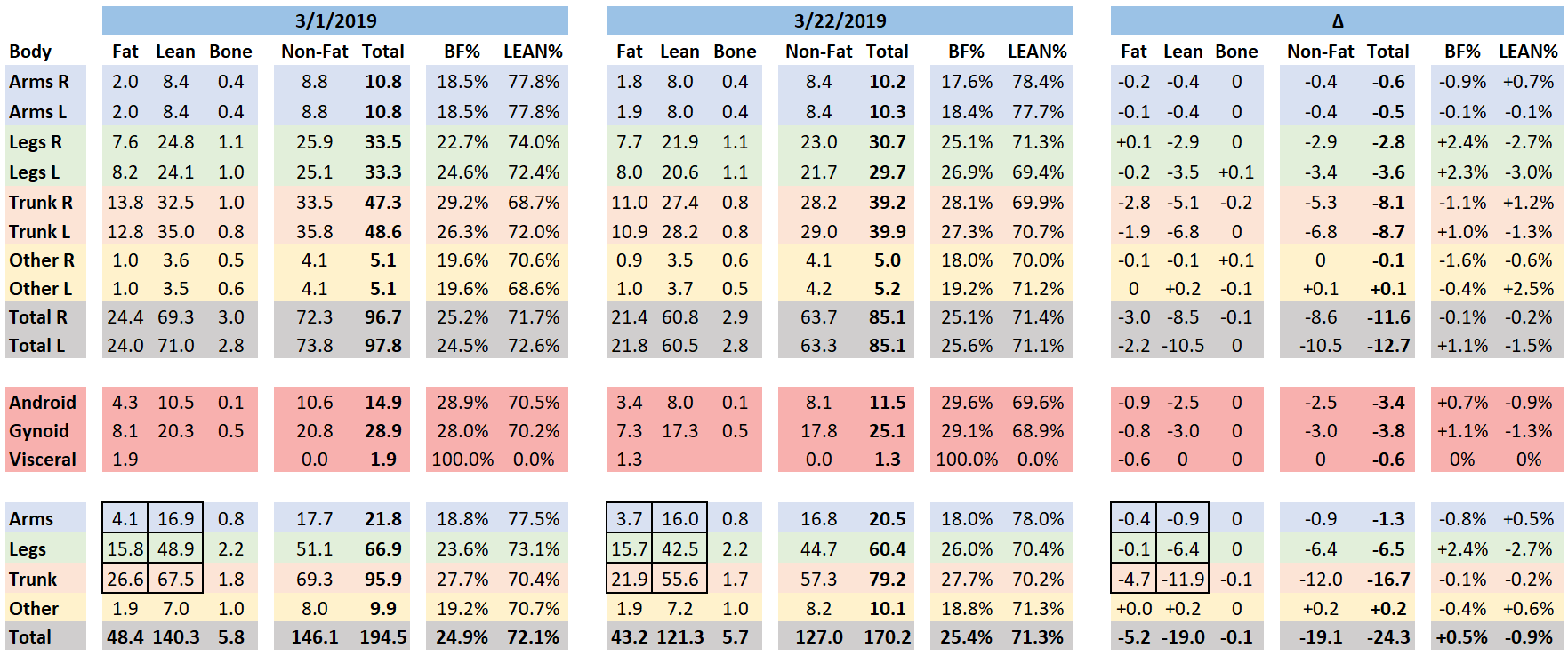 Also… “other” is the difference between the individual body sections and the totals that DEXA provided. I have no idea what’s there, but it didn’t really change much. I’m assuming it’s organs, etc…