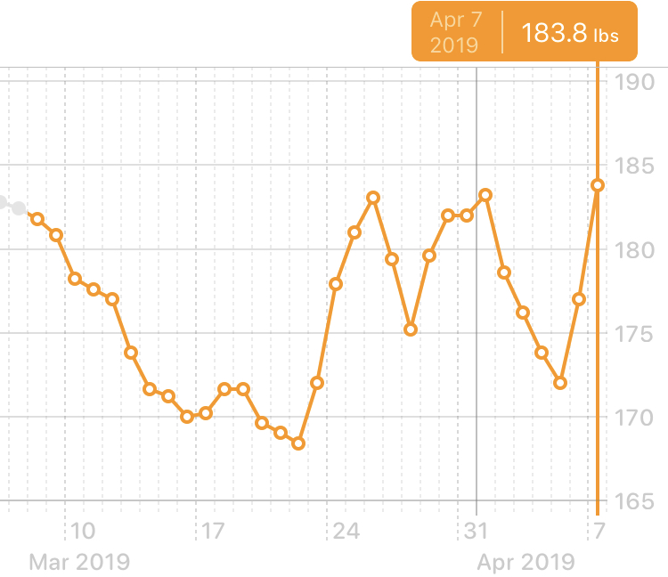 I started this fasting cycle at 183.2 (Monday morning April 1st), so I’ve gained weight on this 5:2 fast with one more feeding to go before its called… maybe I’m pioneering “fasting your way to gains”.