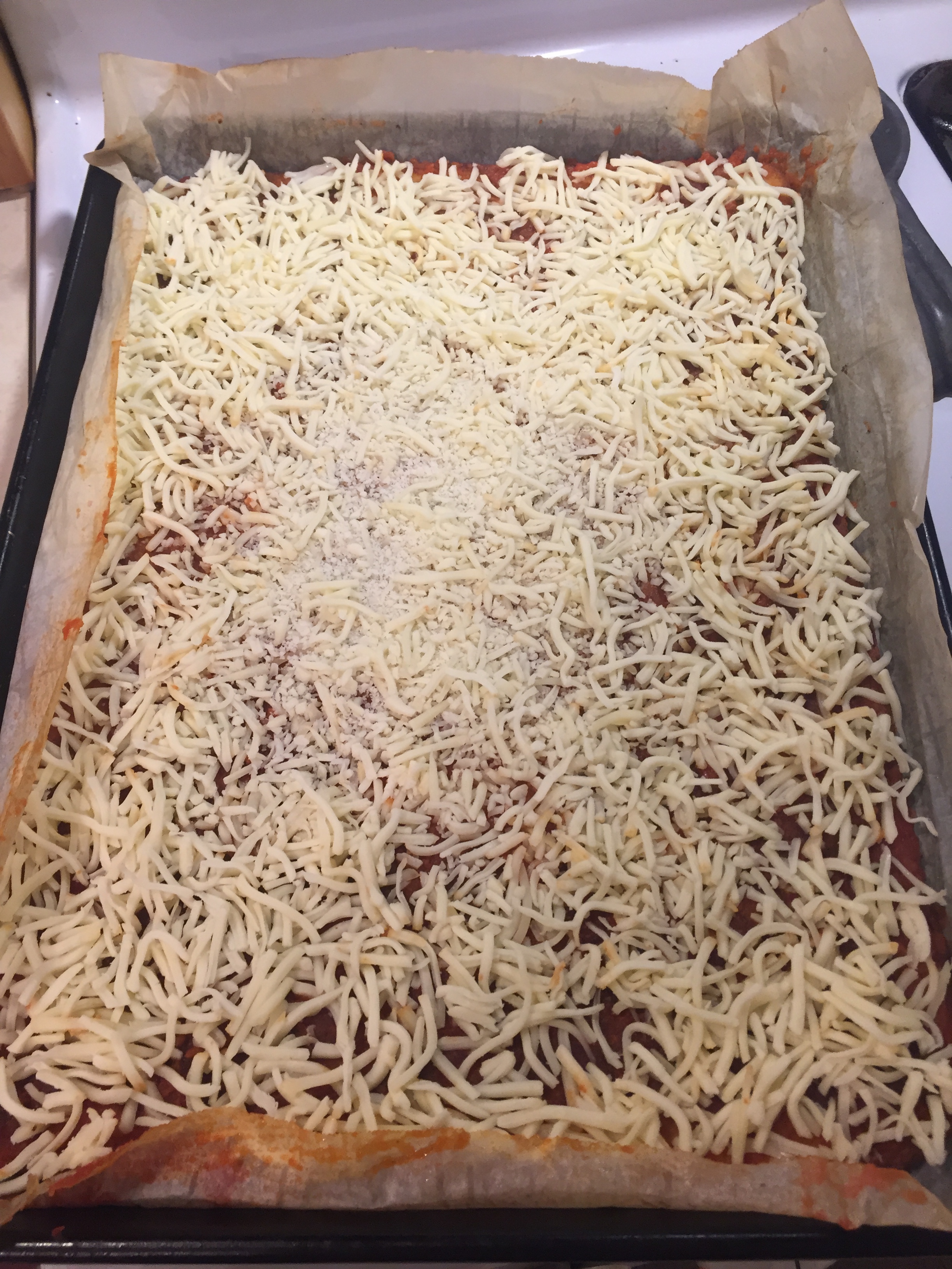 You just push the dough around until it covers the entire baking sheet. When it does I fold over the edges of the bottom piece of parchment. This allows me to create a nice clean edge that is not thin and will not burn. I hope these pics help show what I mean.