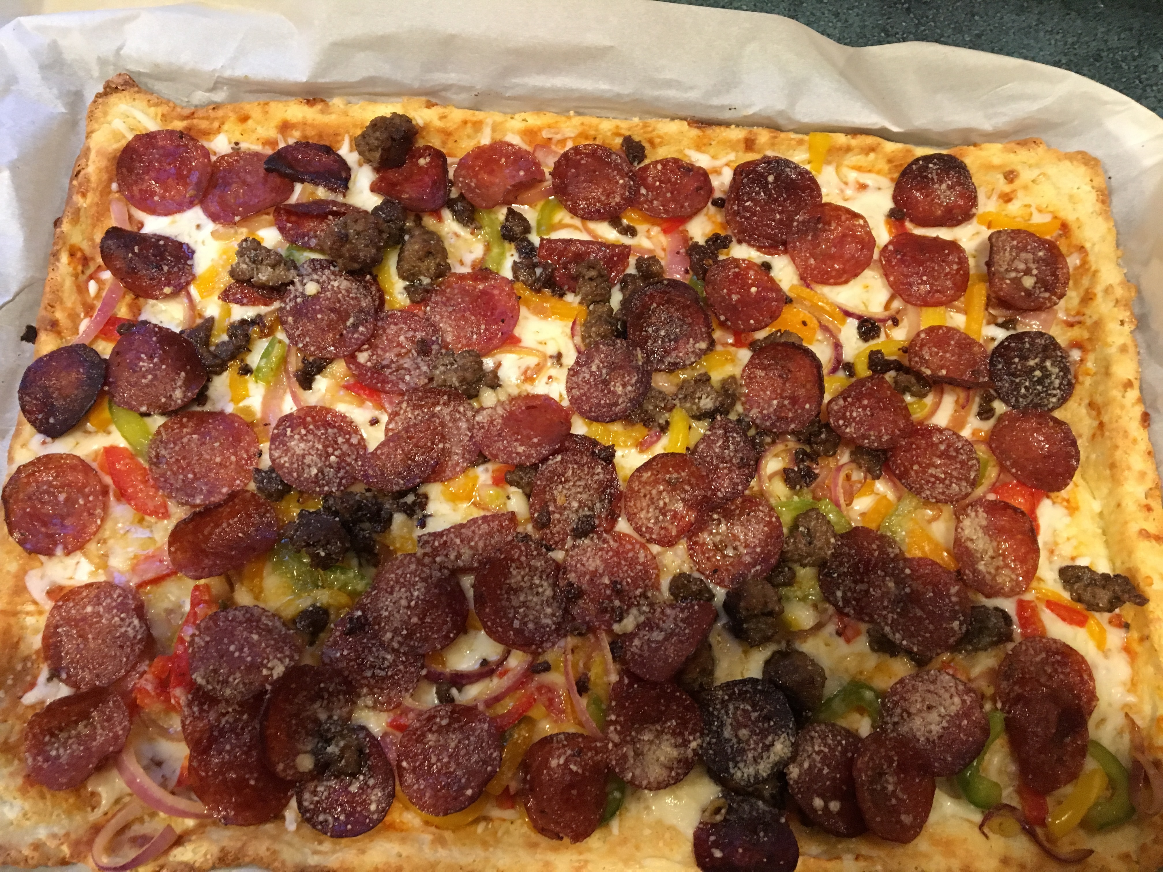Tried your and @carl 's recipe tonightâŠwow, I thought it was so much work to ârollâ the dough. But it was crunchy and delicious, and extremely filling. I added scant sauce, cheese, sautĂ©ed onions and peppers, and pan fried grass fed burger and pepperoni. Then sprinkled with Parmesan reggiano. The center wasnât as firm, but still good. Thanks for all your trial and error