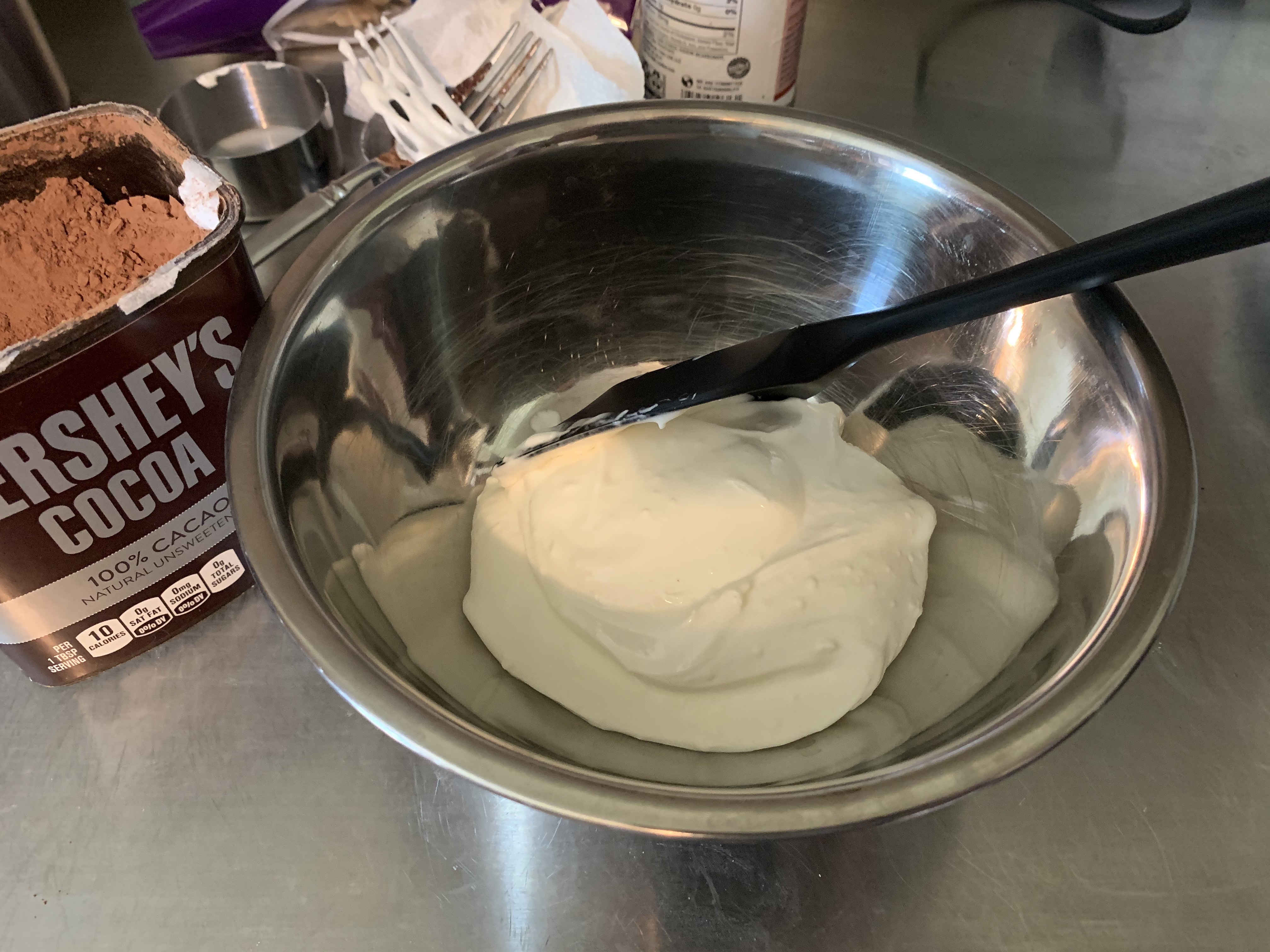 Added 15 drops of Liquid Stevia, (because the added Cocoa)1/4 cup Cocoa and a Large Egg…