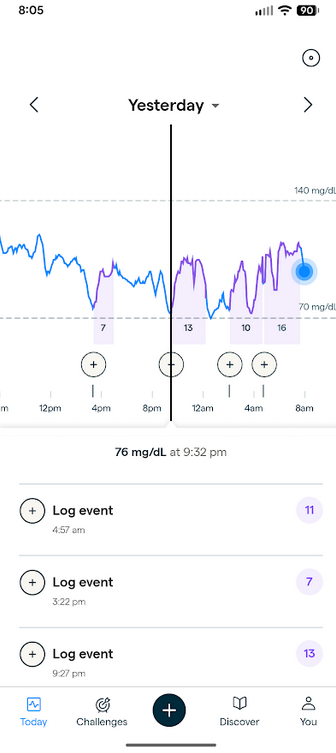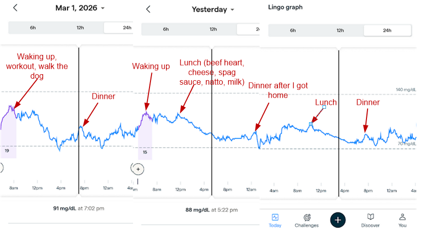 Look at how smooth those were. There are major differences between the systems, though. Back in 2019, I had a reader and read the sensor at locations where the dots are shown. There about 8 hours of data stored. This means you’d miss some data at times. The Libre also took data every 15 minutes I believe, and it “smoothed” things out, because the internal data was supposedly noisier.