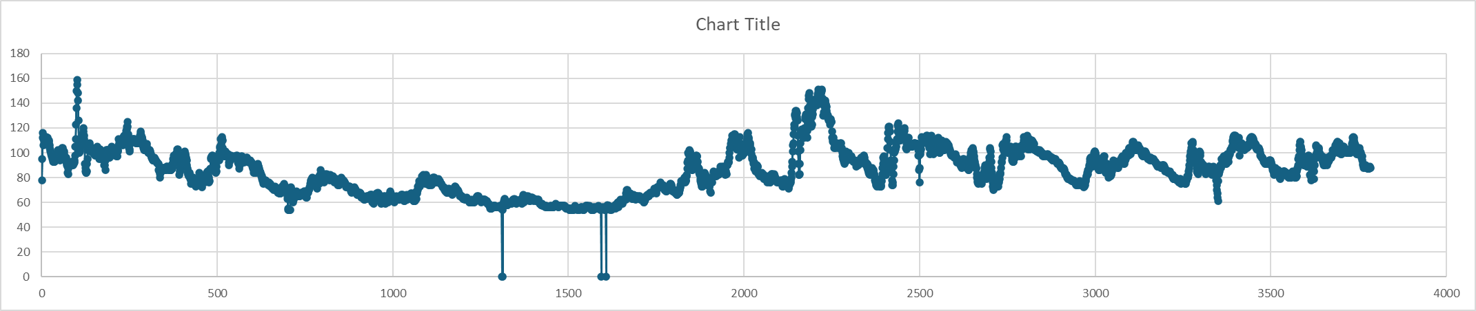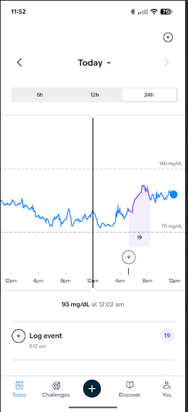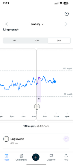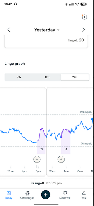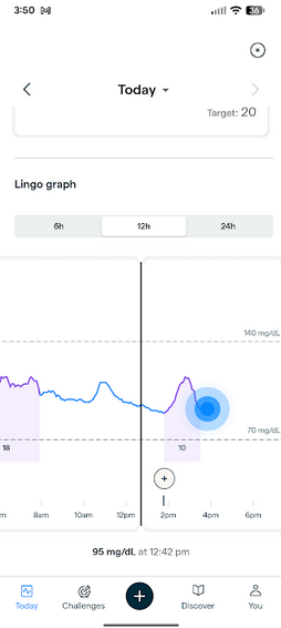 Both systems could provide a larger version of a narrower range. The Libre’s range is 350 md/dL, which is why my blood sugar gets “squished”. Similarly, the Lingo concentrates on the 70-140 range. I think it shows up to 230 (or around there). The highest blood sugar I’ve had in the last few days is 122, and that was this morning during my workout. The lowest was 68. Maybe they could allow you to make the shown part larger?