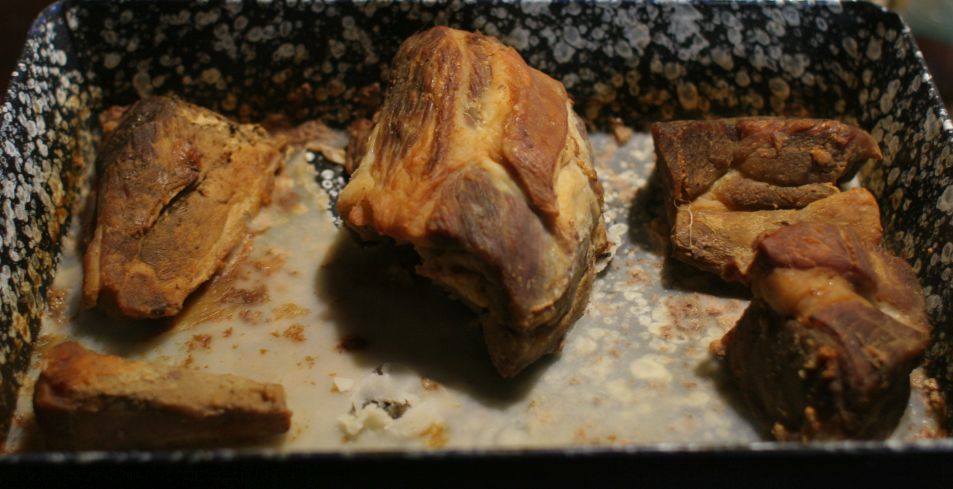 I put it into the other carni thread but here, my pork chuck roast leftover before I ate the right 2 little pieces except a few bites. Because I ate a lot of my soup chuck too. And 2 eggs and this and that.