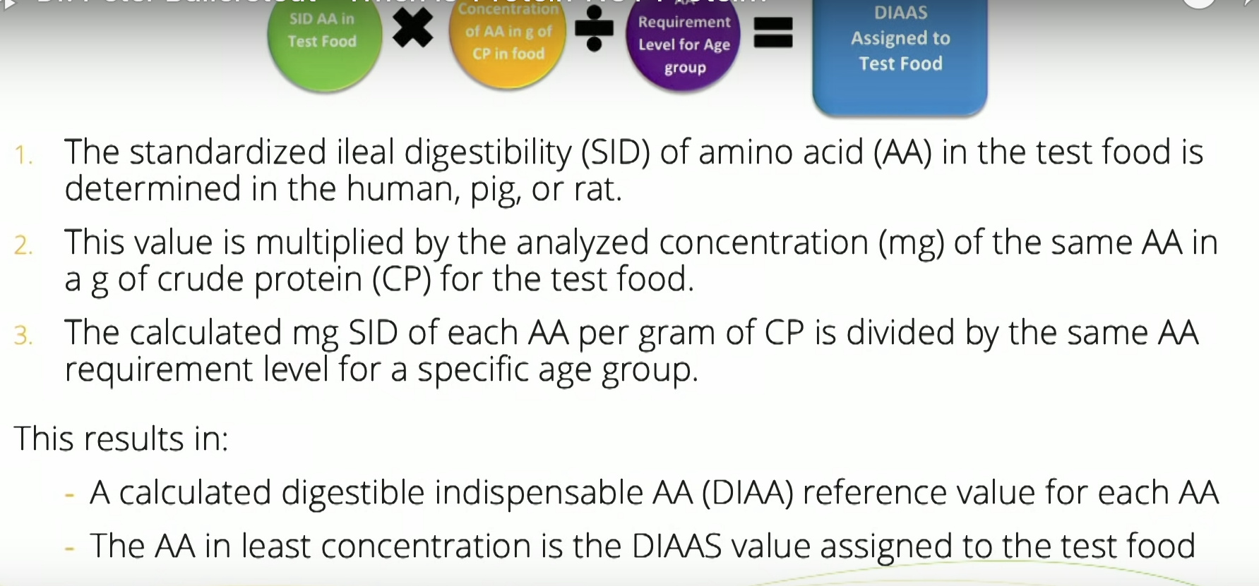 About 2013 a WHO expert panel made the recommendation that we need to move to something called DIAAS Digestible Indispensible Amino Acid Score. This is something that will rely on pig ileal samples rather than rat fecal samples to determine digestibility. And if you understand the terms, you already understand some of the difficulty involved. This gets more and more expensive, but itâs a very complicated thing. And we can no longer rely on micro(kâŚ?sp?) to give us percentage nitrogen and just do the math in a spreadsheet.