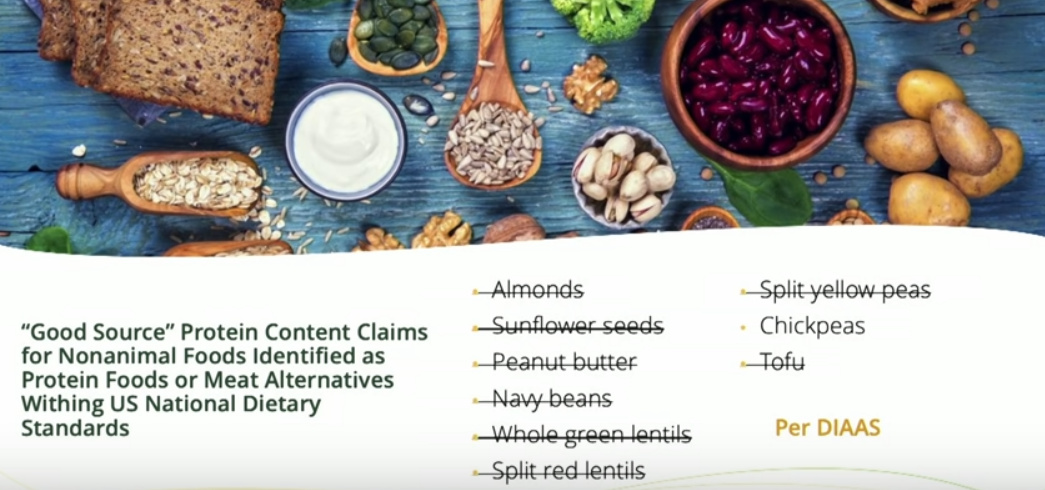 Letâs just look at practical application. I think if you look at this list of protein foods, most of those would fit in someoneâs understanding of a good protein source, yes? Well even by PDCAAS the almonds, sunflower seeds and peanut butter donât qualify. When we go to DIAAS, only chickpeas qualify.