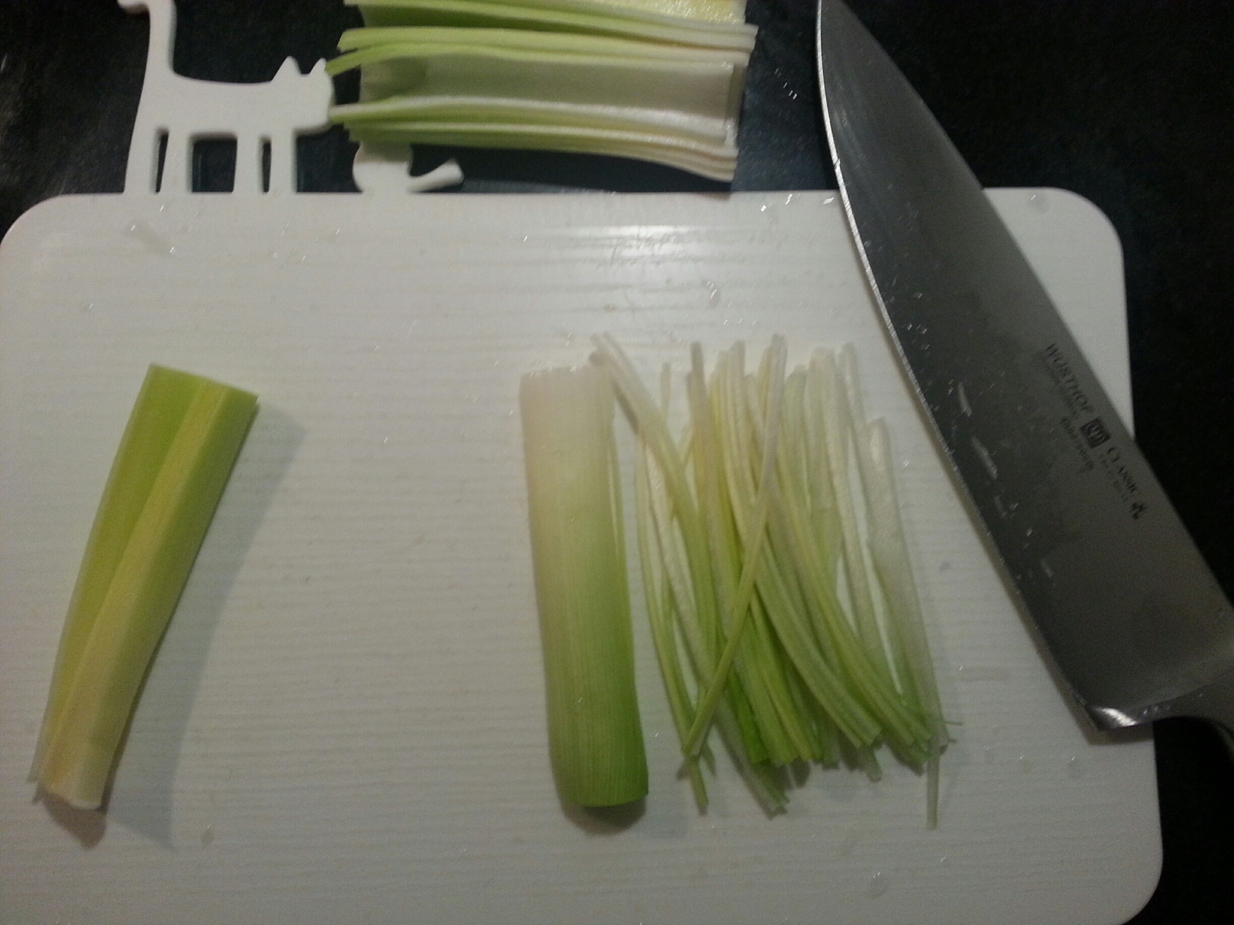 While the leeks are drying, heat up an inch or two lard in saucepan. Get it hot for frying the leeks. Drop one leek piece in…it should sizzle right away when oil is hot enough