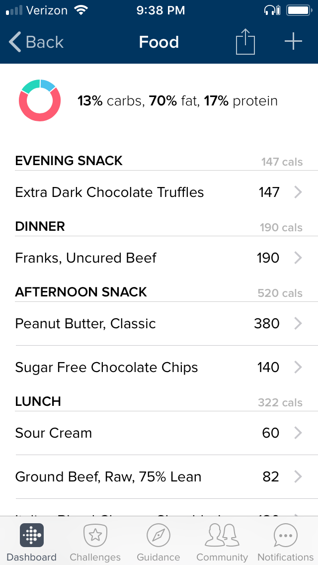 Two your peanut butter intake IMHO is too high, that is roughly 4 tablespoons, that is a lot. I put that amount into a weeks worth of fat bombs. Combine that with some of the things that may stimulate an insulin response like the chocolate chips. If you are trying to get fat adaption I would shelve the sweet treats for awhile, every insulin response pushes that back a little more.
