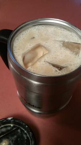 I make the coffee ahead, put in the mug when ready with cream and sweetner but not the ice and leavee in the freezer for some hours so the brew doesn’t melt much of the ice, the colder the better. I mix the coffee water and grinds then separate the grinds from the coffee by pouring through my coffee maker with one of those resuable metal filters. Paper plugs up too fast.