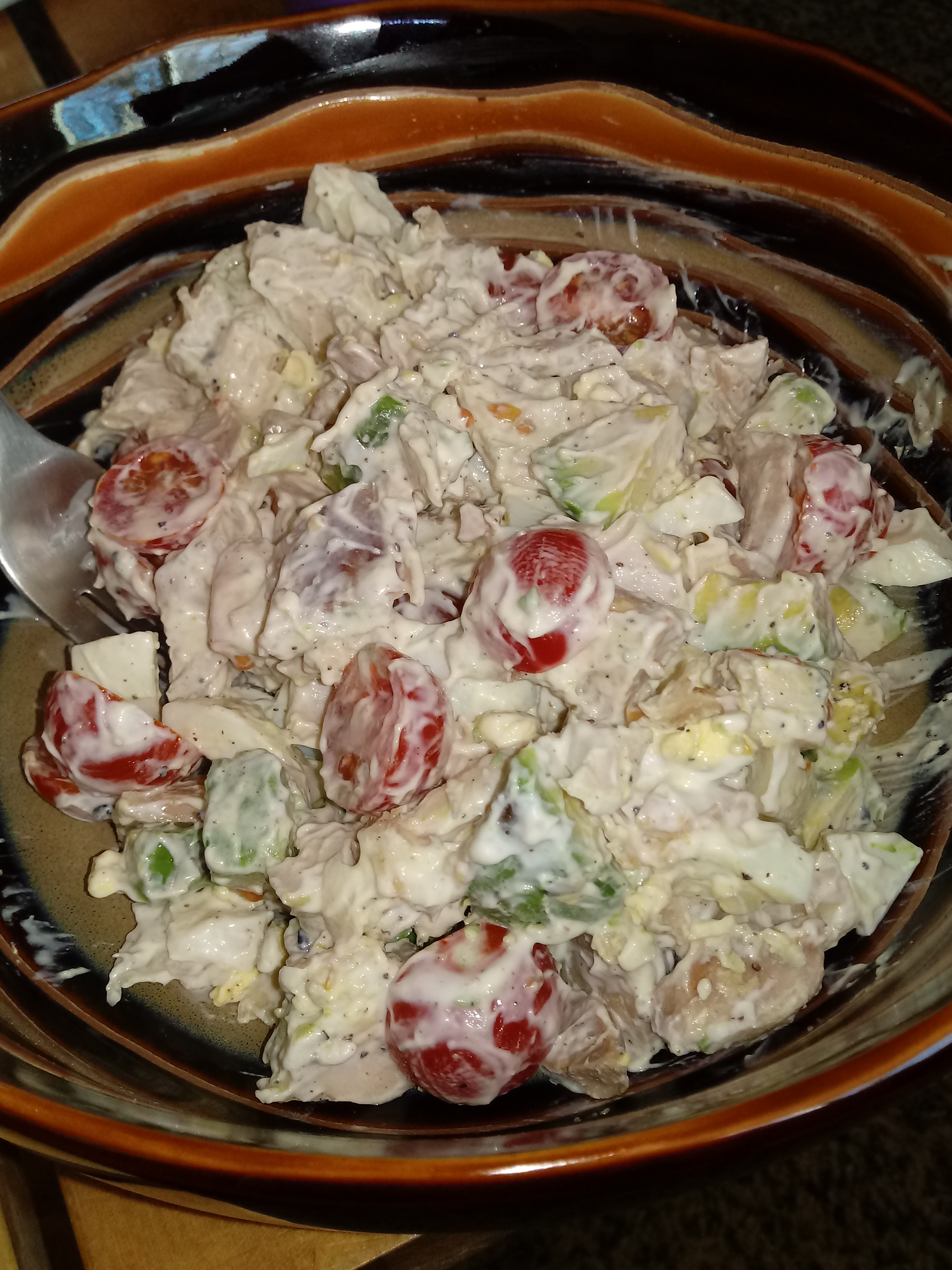 My first meal isn’t for another couple of hours, but it’s ready! Chicken thigh meat, avocado, bacon, boiled egg, and tomato salad. I’ll eat it on a couple of leaves of butter lettuce and some Wee Brie cheese.