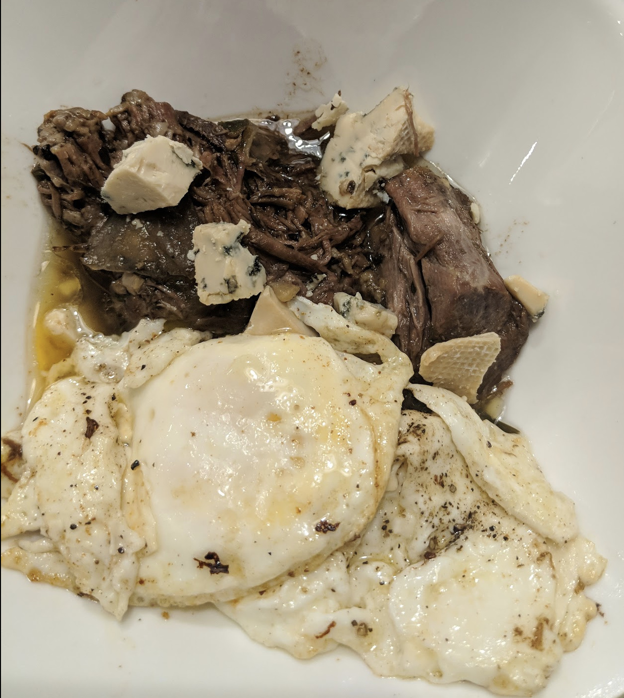 Pot Roast with juices reduced. 2 Fried eggs cooked in amish butter, and some home smoked blue cheese. Drinking tea now with 1 oz of coconut milk.