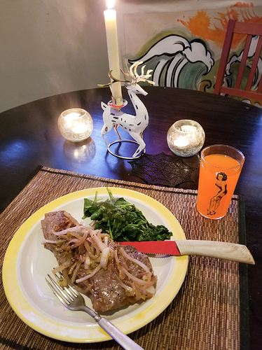 Tonights dinner rose veal steaks sous vide for 6 hours at 53C with some mushrooms in creme fraiche with pepperoni… Picked up Christmas food at the butcher and our friend behind the counter tipped us off about the veal… yummy