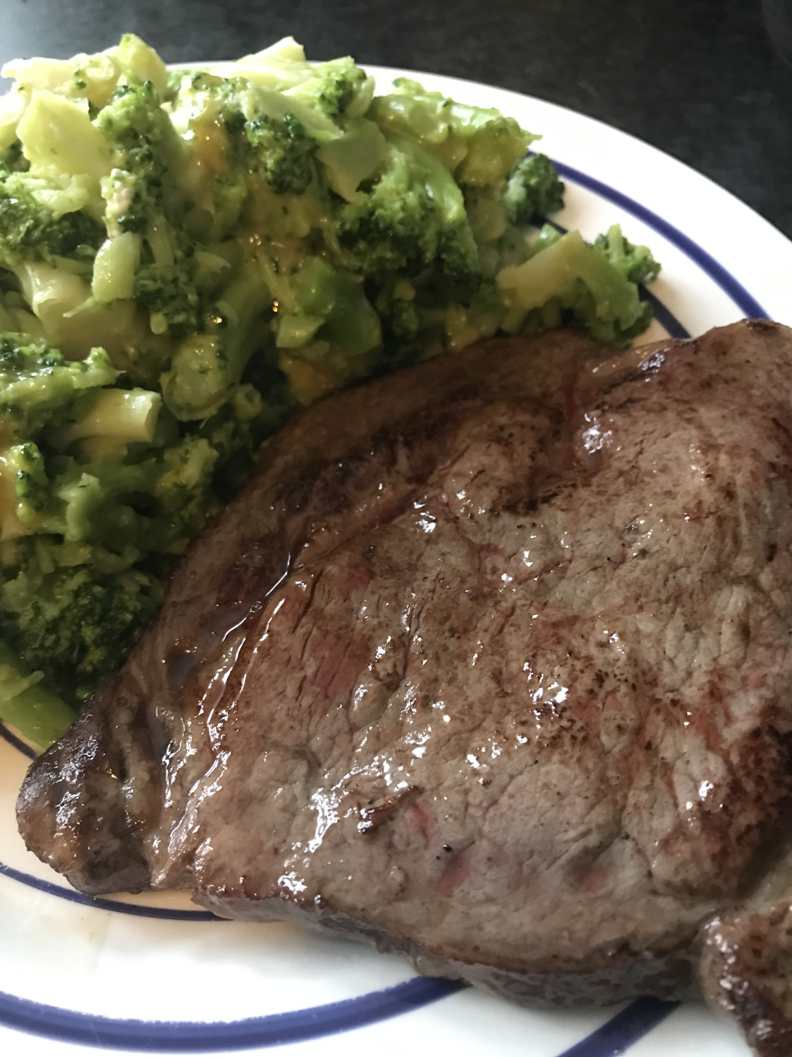 A fatty piece of sirloin cooked in ghee, with broccoli (rescued from the depths of the freezer) mixed with Kerrygold and mild cheddar (and salt).