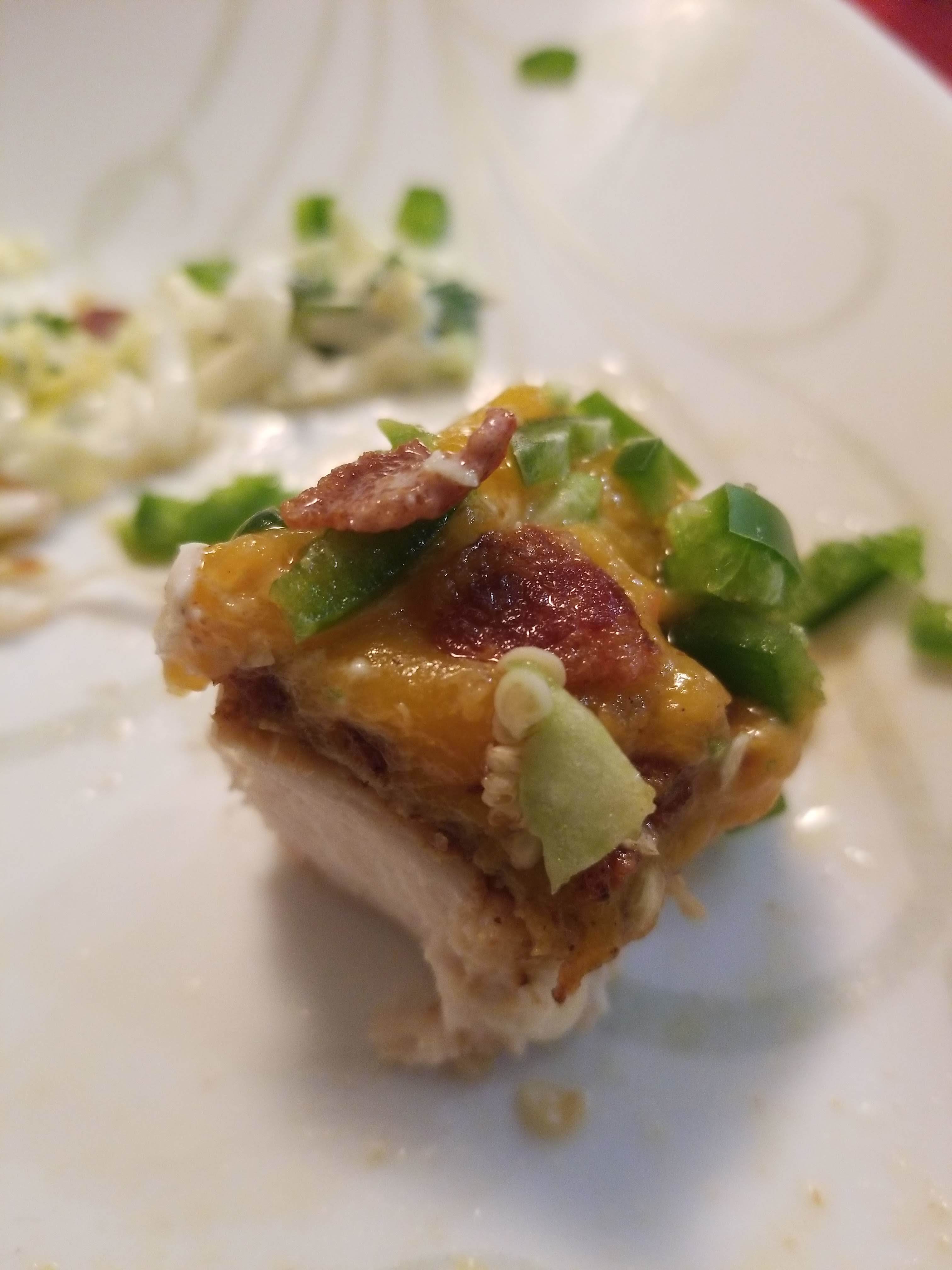 I put a spice rub on the chicken, brown it in a frying pan on the stove and finish it in the oven. Once it is about done, I add the toppings and let it melt in the oven.