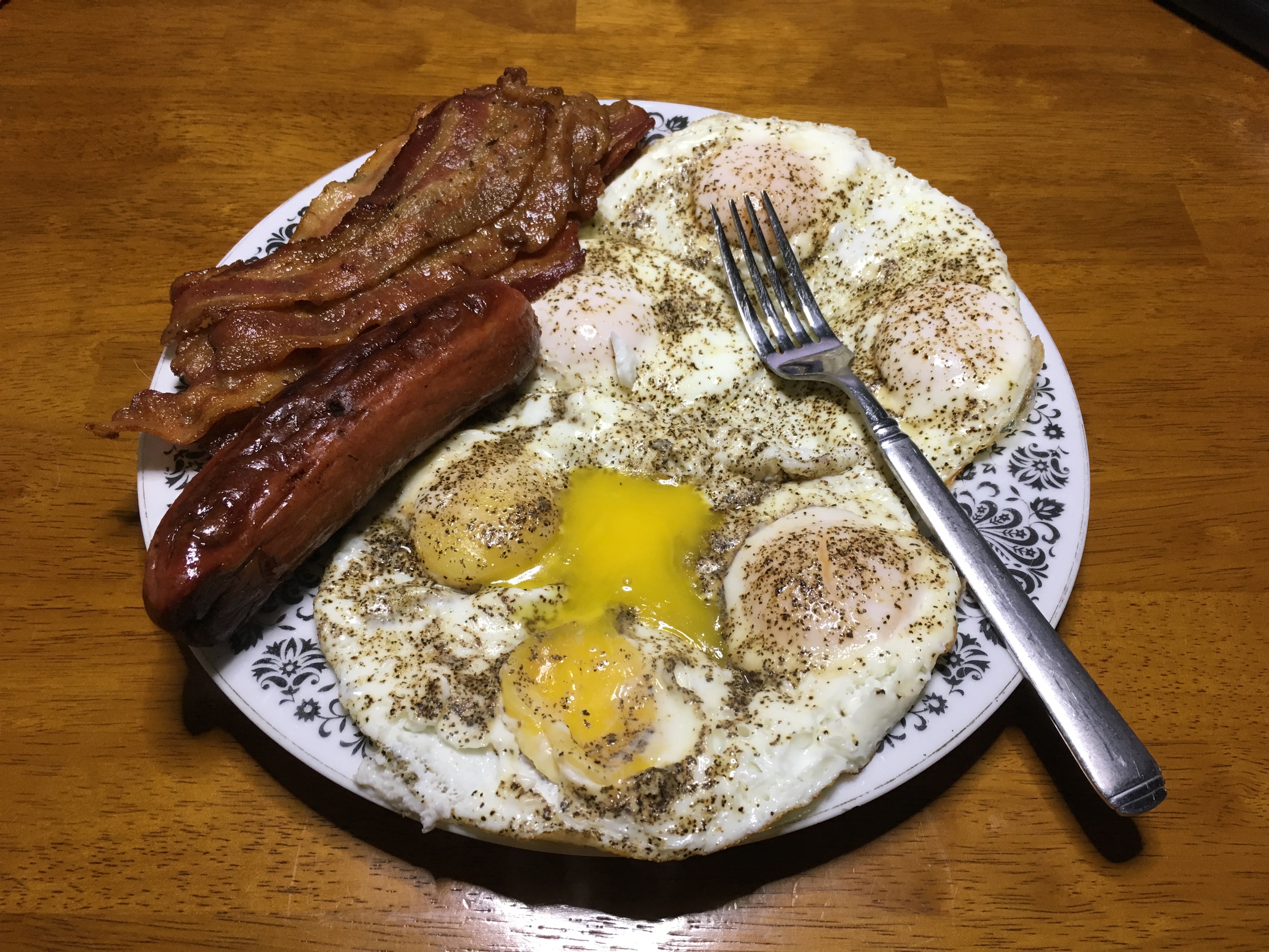 Then Eggs, Bacon and a Knockwurst. … Someone broke an egg putting it on the plate, but I won’t mention any names.