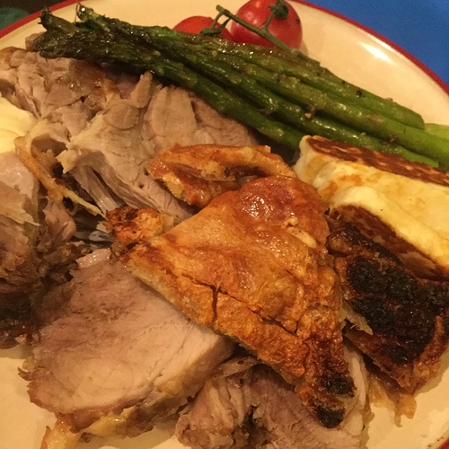 All day low & slow pork butt with crackling, hallomi fries and a couple grilled baby toms and asparagus.