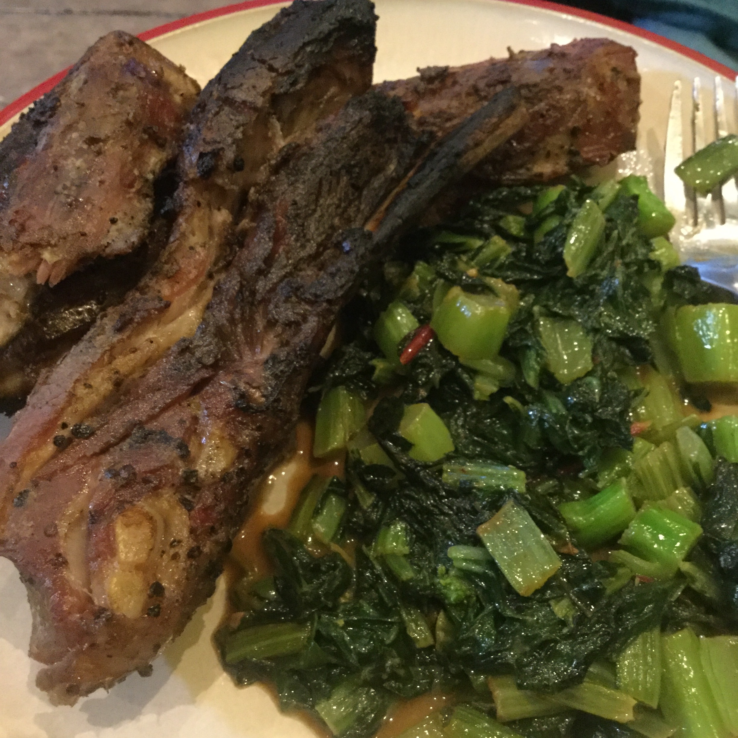 Dijon mustard slow cooked and then grilled thick pork spareribs with choy sum and rainbow chard greens .