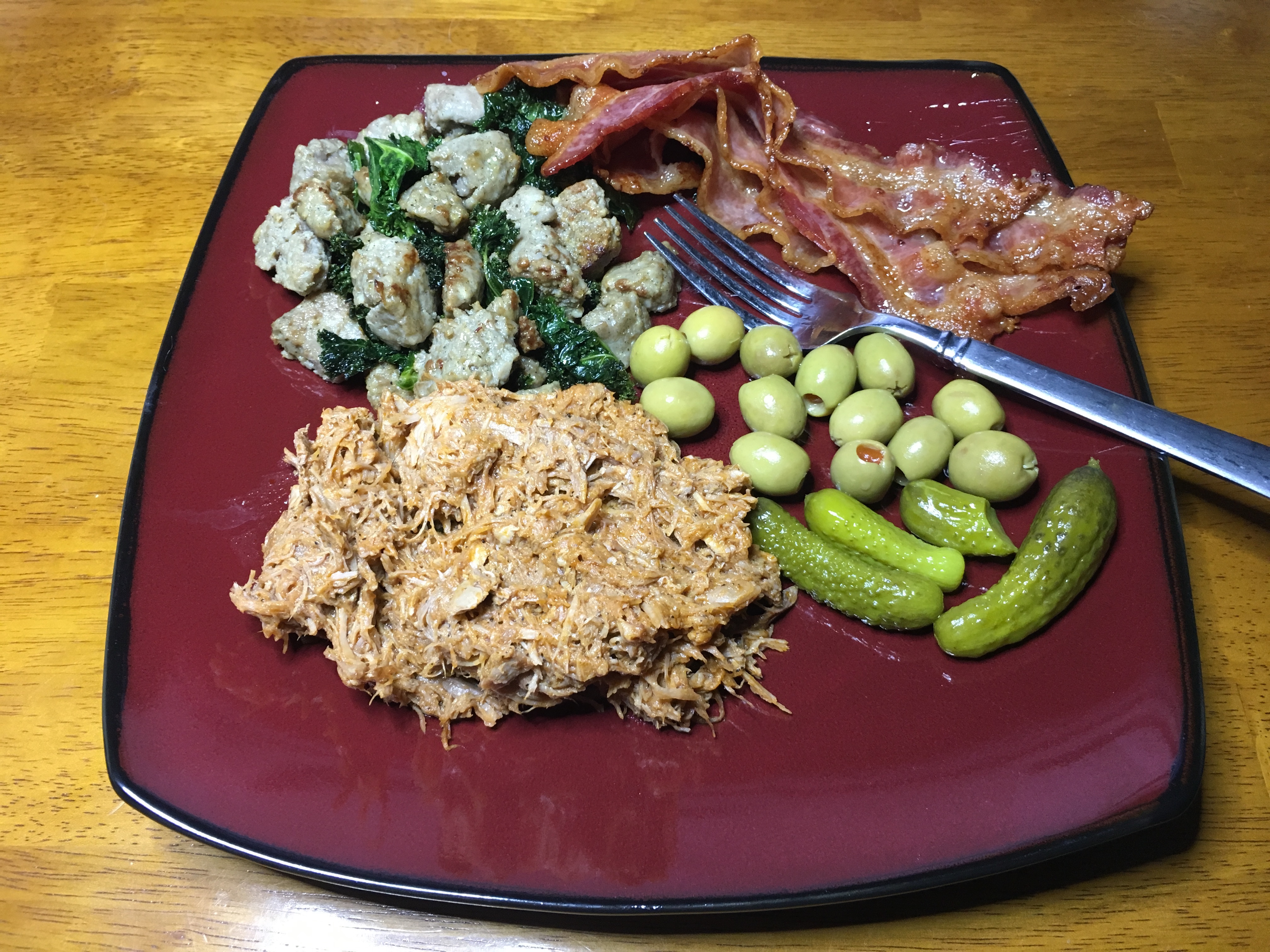 Decided to go with TMAD today⌠Giant Brussel Sprouts, Pickles, Olives, Country Sausage & Kale, Pulled Pork and Bacon. Then had a small bit of Halo Top, Chocolate Ice Cream.