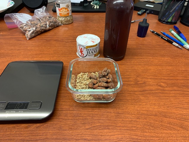 Also had 1oz. Almonds, and 30g Sunflower Seeds and Deviled Ham for some added Salt.