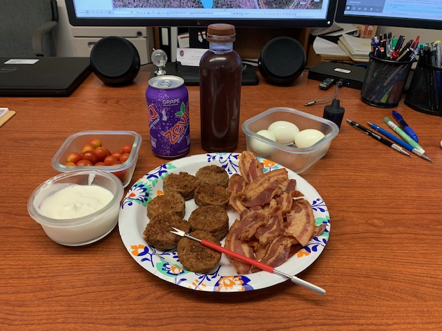 Sausage, Bacon, 3 Boiled Eggs, 4 oz. Cherry Tomatoes, 4 oz. Greek Yogurt, Grape Zevia and Iced Tea.