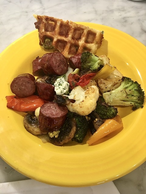 Last night’s dinner was a medley of roasted vegetables topped off with an herb compound butter. And some grass fed smoked beef sausage. Edit: a dill pickle chaffle. I love bowl food