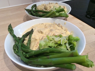 Chicken Dijon (chicken thighs, onion, mushrooms, mustard, loads of crème fraîche) and veg. Perfect bank holiday supper.