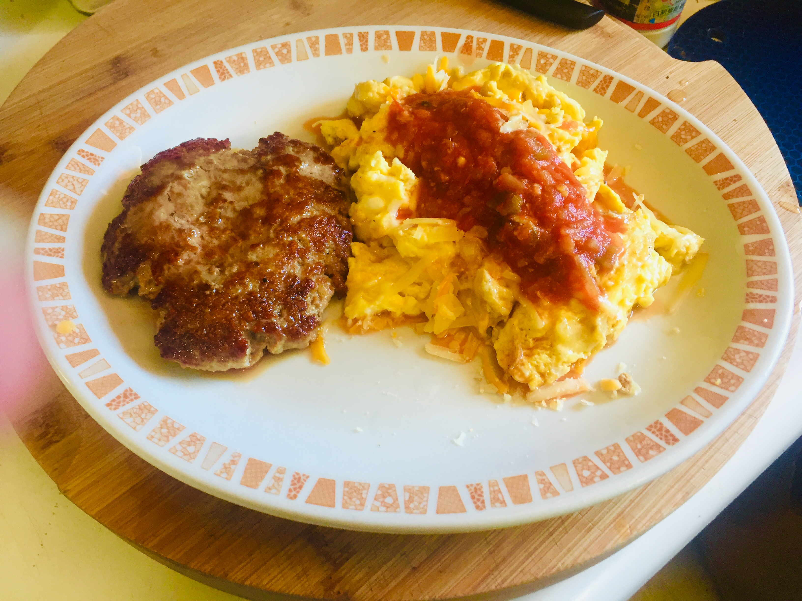 Decided to make a quick Lunch… Couple stacked Sausage Patties on a Egg-type bread with Swiss Cheese and some of the Egg-Foo-Young Sauce I still had from the other night. Plus an extra patty.
