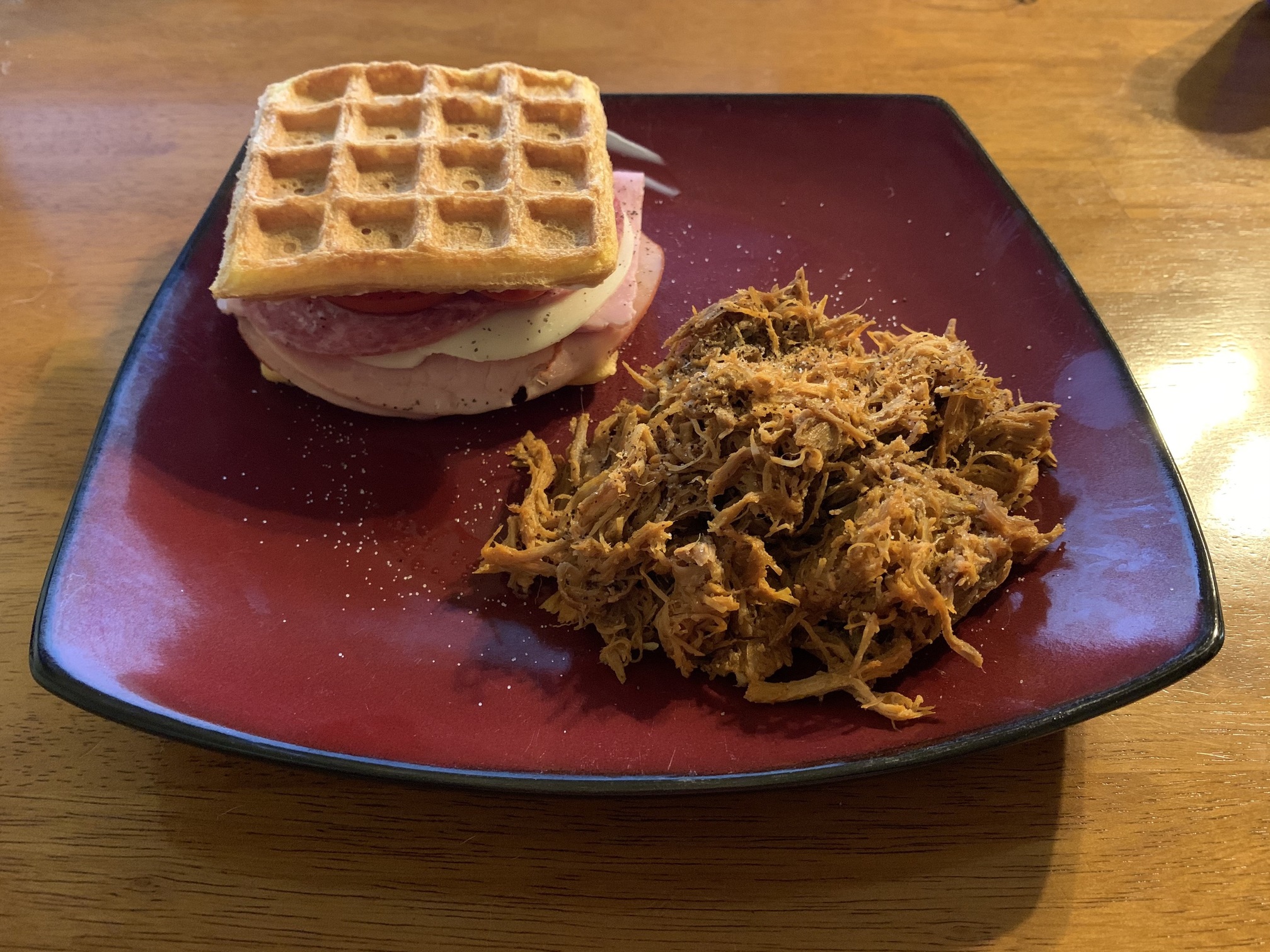 Lunch… Italian Chaffle Sandwich & Pulled Pork - Dinner… Country Steak, Ribs & Brussel Sprouts.