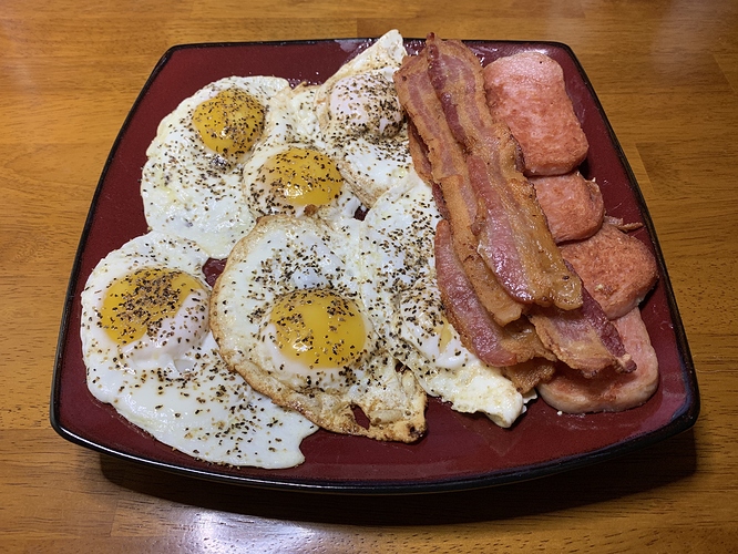 A quick Keto-meal for my TMAD… Eggs, Bacon and fried Spam. Now off to make two more Cheese Cakes for the weekend.