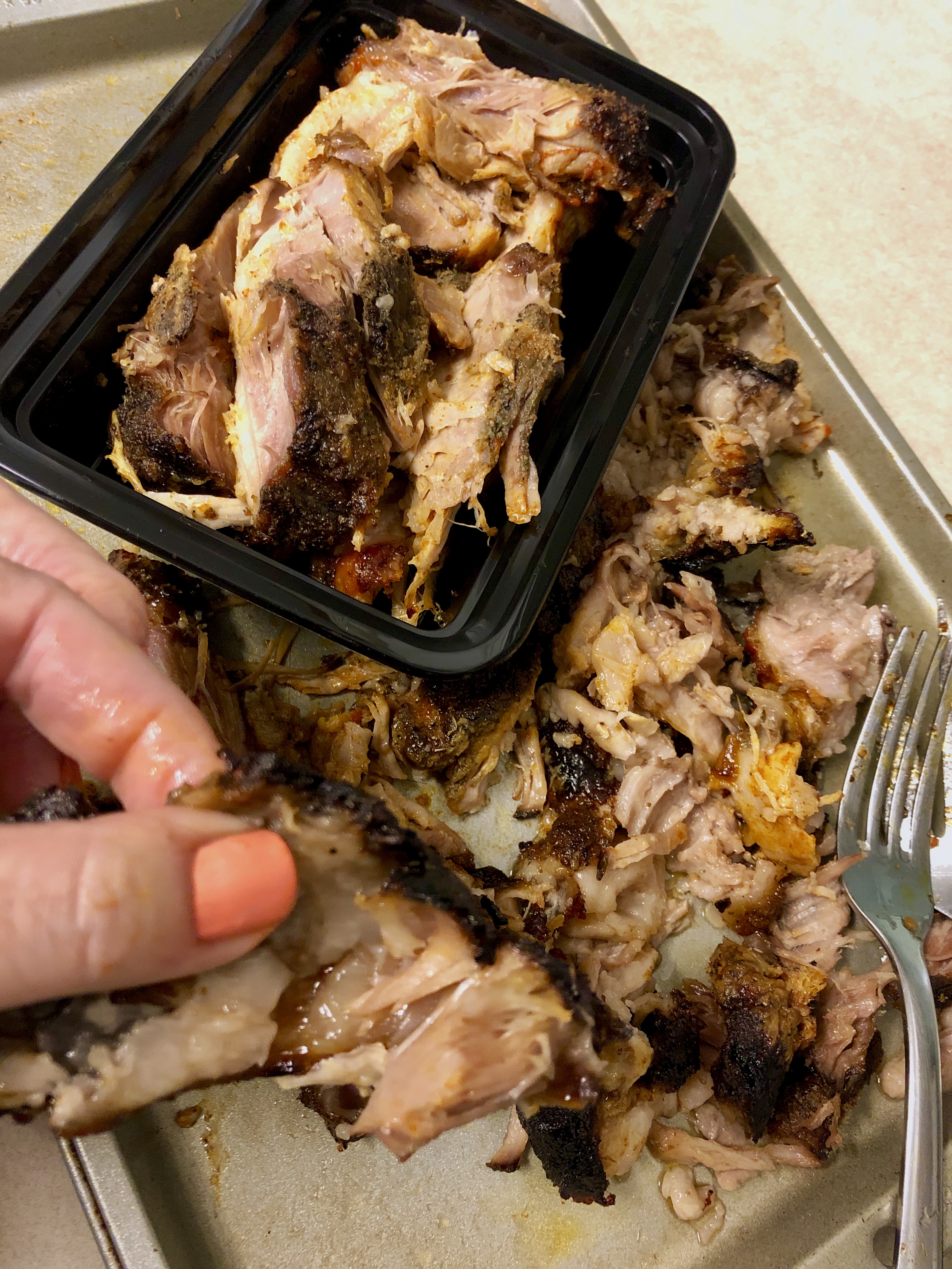 I had a full dinner planned with asparagus and side salad to go with my roasted pork butt but never made it past the pork. After I let it rest for a few minutes, I started pulling it apart and stood there, at my kitchen counter for 10 minutes, eating all the crusty fatty outsides and whatever pork was attached to it.