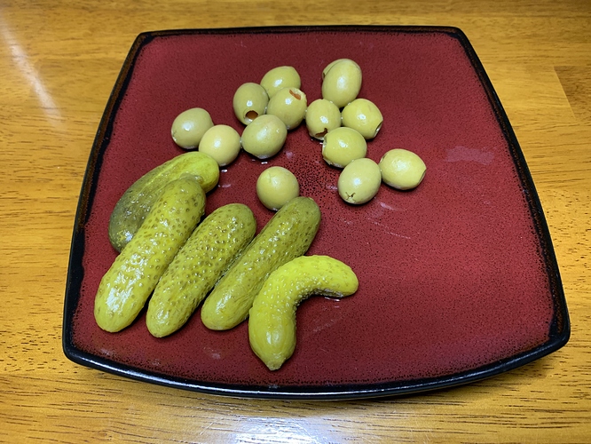Venison Cubes with Mushrooms and Scallions, fried up in butter. Then added a block of Cream Cheese to make a Sauce. Egg Salad and some Pickles and olives on the side.