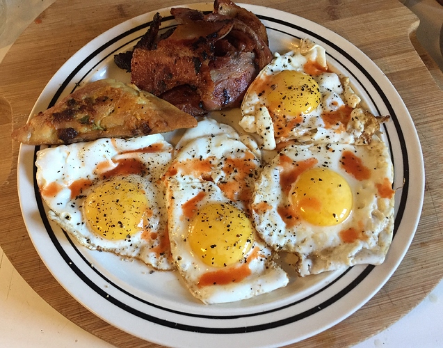 Quick meal between butchering the Deer. … Eggs, Bacon, Sausage, one Salami Popper and some London Broil strips. Also an Almond Milk and 2 Squares of Ghirardelli Dark Chocolate.