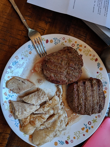 I am changing to TMAD for a little bit. So, though I didn’t get a pic of lunch … it was 2 x 1/2lb beef patties. Dinner was 2 x 1/2lb beef patties and the fat cap from a pork tenderloin I cooked for the wife.