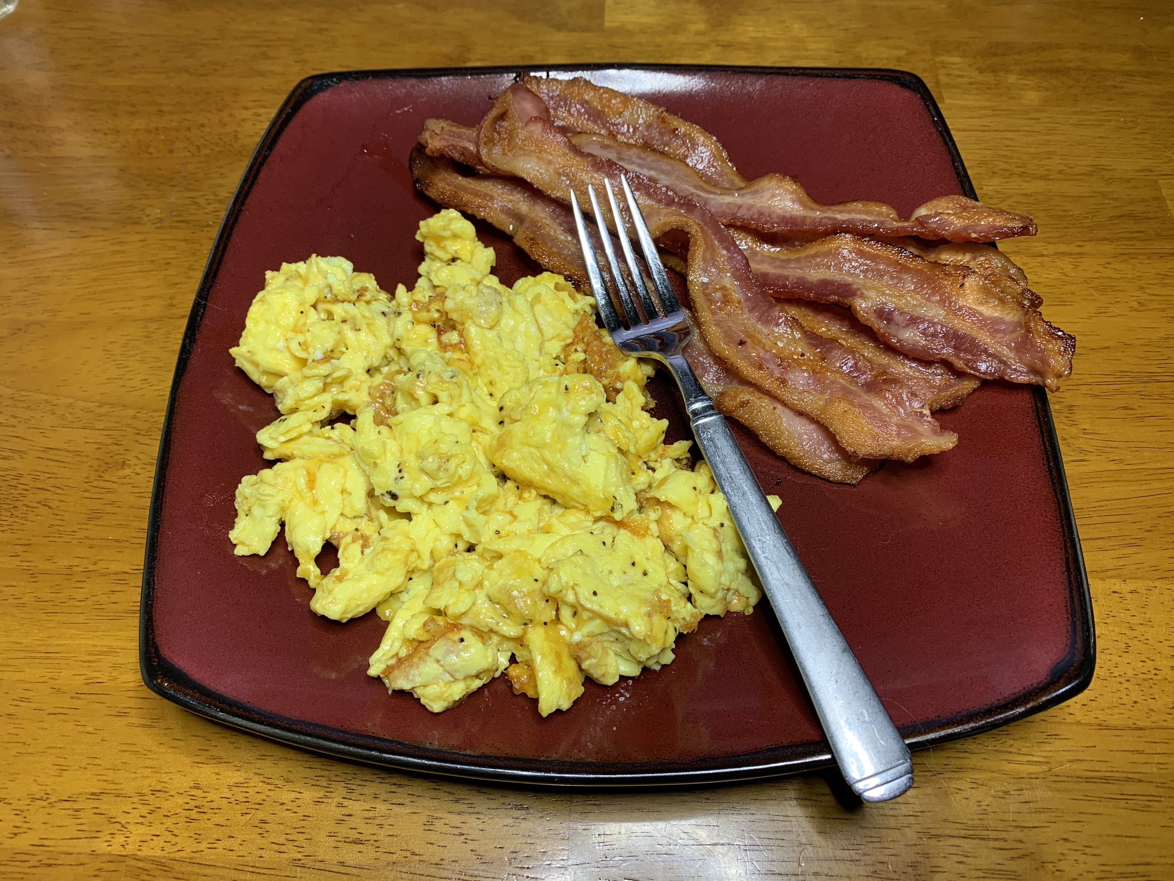 I opened my eating window an hour early today so I could have a lazy, Saturday pre-noon brunch with my love. Egg scramble with bacon, zucchini and cheese, topped with spring onion and a big ol’ mug o’ coffee. I’ve not been adding the breads and spreads to his plates lately. I think he notices but doesn’t mind. Seems the guy is turning covert keto. **update as of 2:00pm- Nevermind. He just came upstairs and made himself a grilled cheese sandwich. Jeez man.