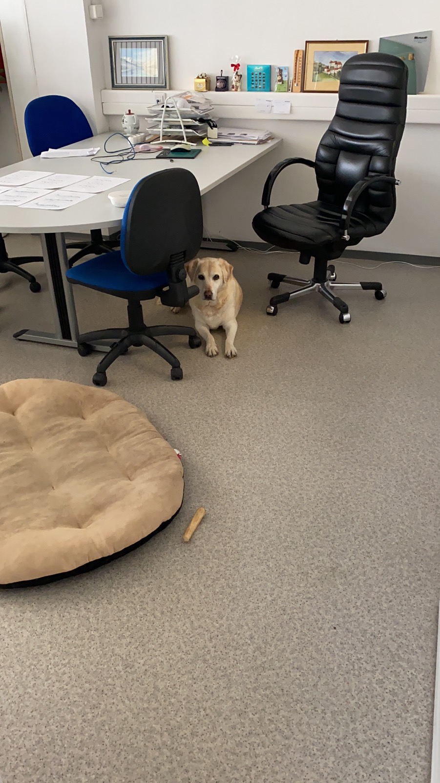 Tara joined me at work today, techs are working from home, I prefer my daily routine of business as usual… Our director comes by in the mornings and afternoons, as always, (his wife is driving him nuts at home ;)) and he loves dogs, so he was hanging out all morning and she just stayed in his office - she must feel safer there