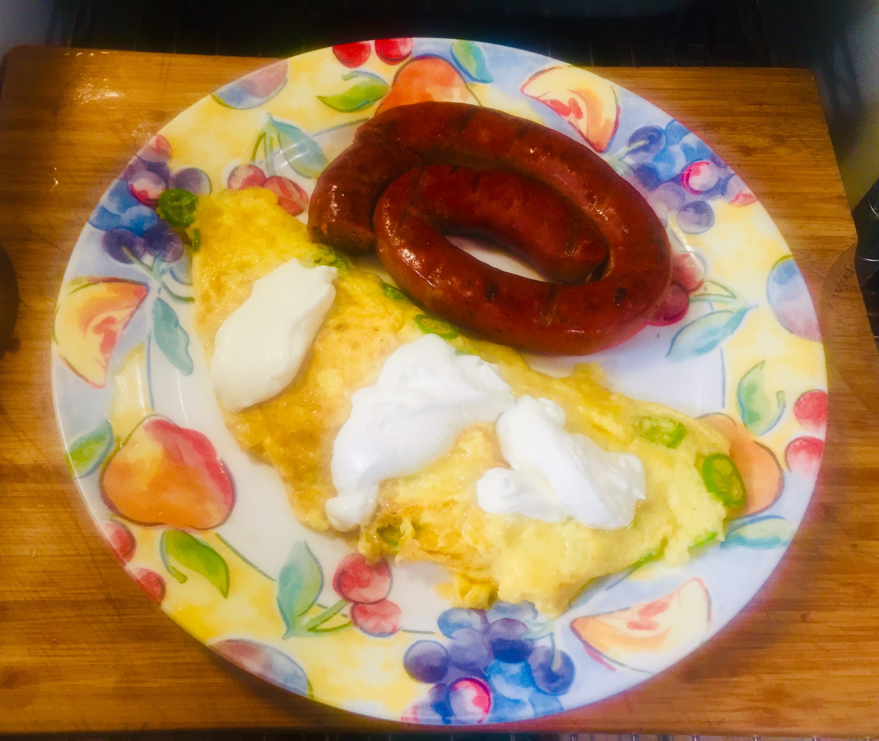 Andouille with Cheddar Omelette and a Serrano Chili Pepper