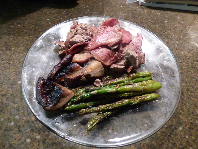 Tuesday OMAD - bacon, chicken liver marinaded in spiced sweet cream, Portobello mushroom, asparagus.